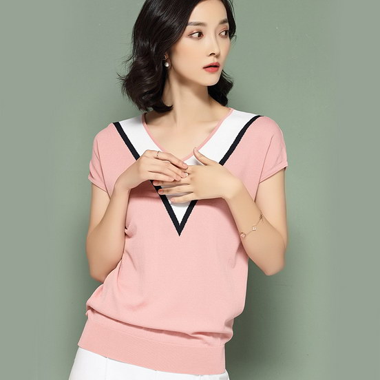 Ayumei 夏季冰丝针织衫女套头宽松短袖Tee恤薄款V领短款修身上衣